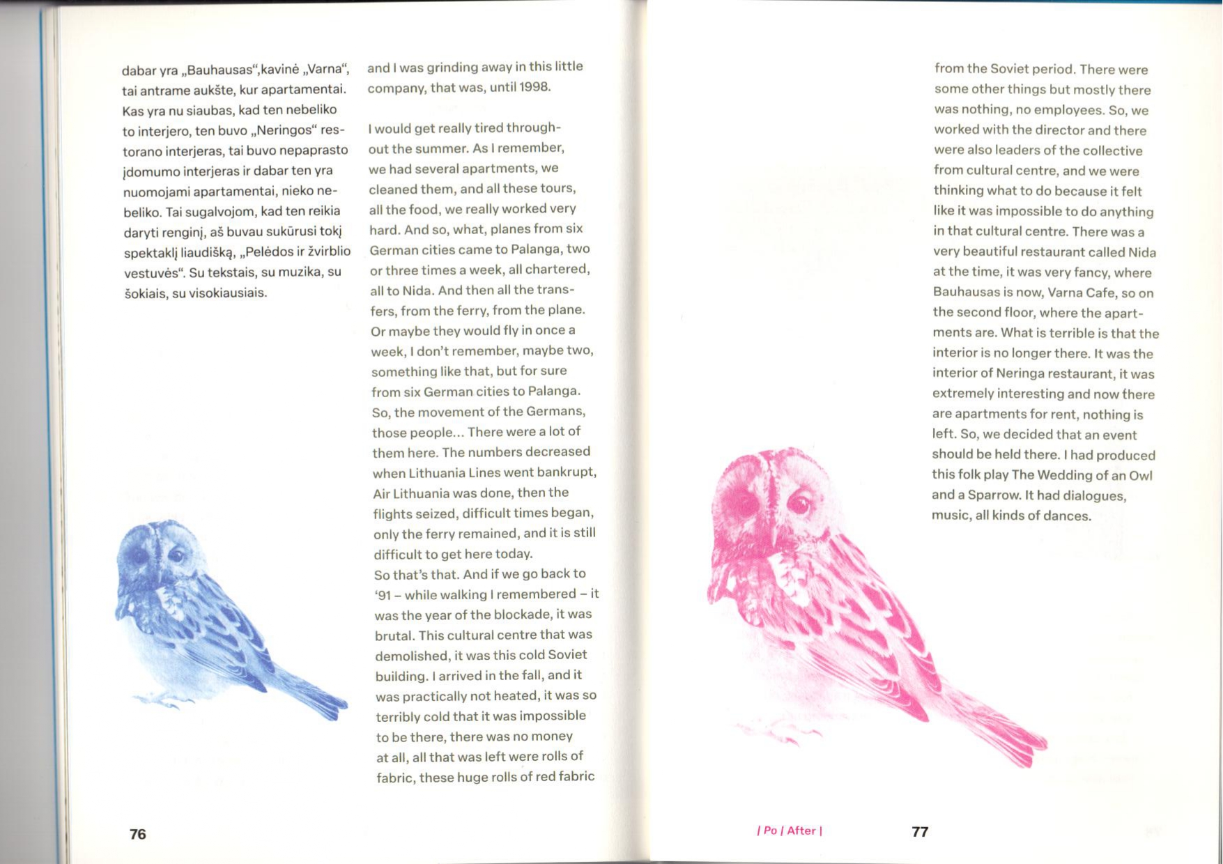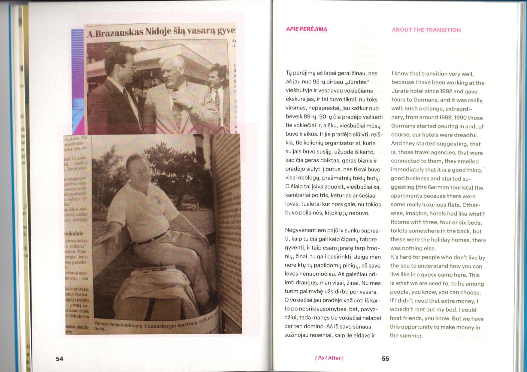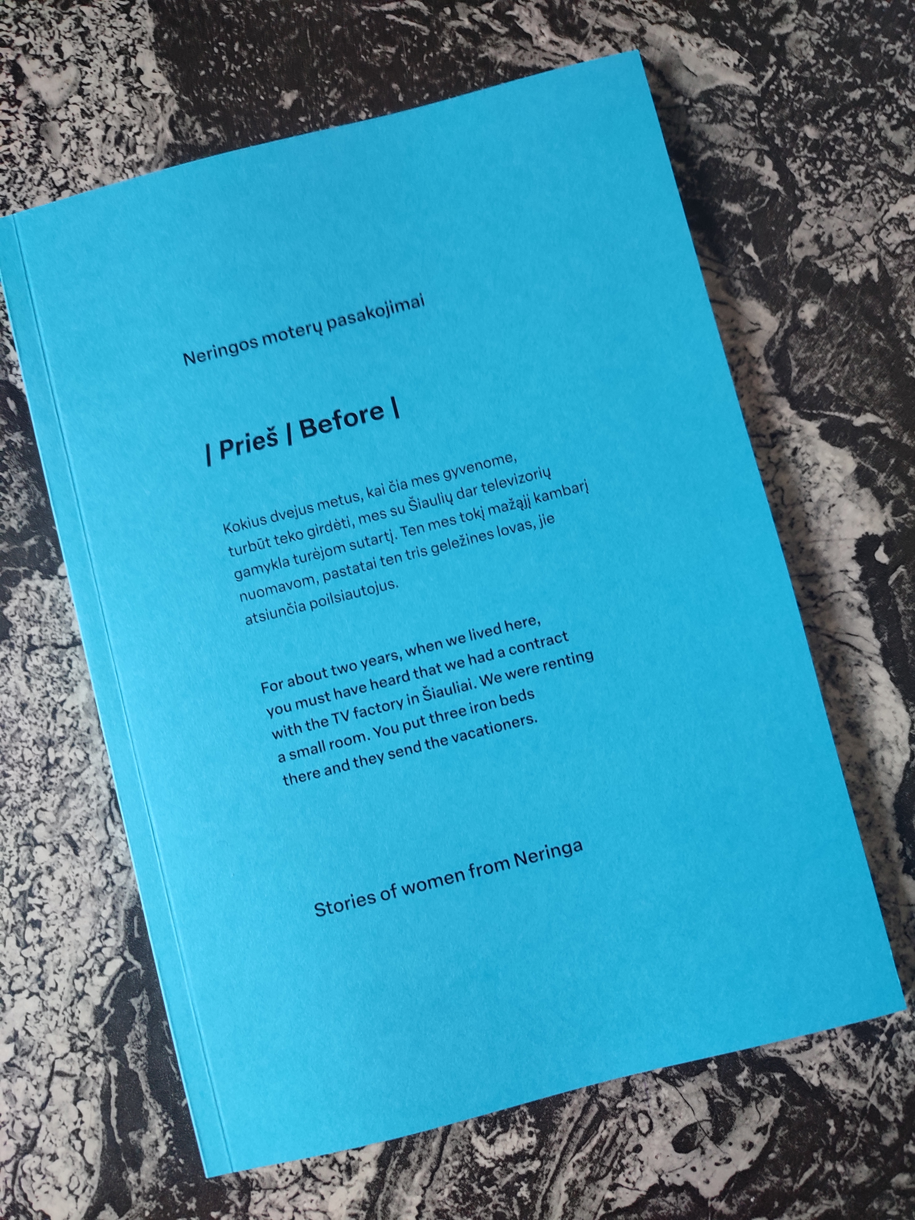 The book Before I After: Stories of Women from Neringa consist of an introduction by Agnė Bagdžiūnaitė who made situated micro research in Neringa and fragments of the stories of Neringa’s women, structured in two main parts: before and after. The researcher talked to women living in Neringa about their living and working conditions in Neringa during the Soviet era and the changes they experienced after Lithuania regained its independence. At the same time, the women talk about the changes in the town’s resort industry, the influence of the fishing industry, and the peculiarities of German tourism in Neringa, which began in the 1990s.