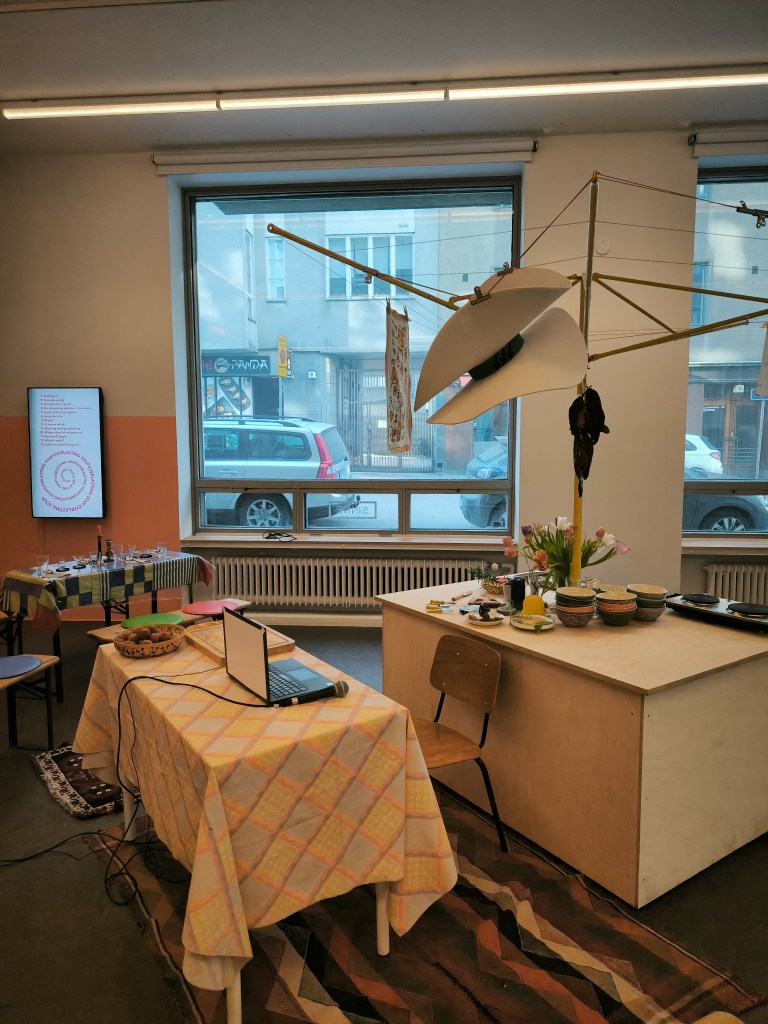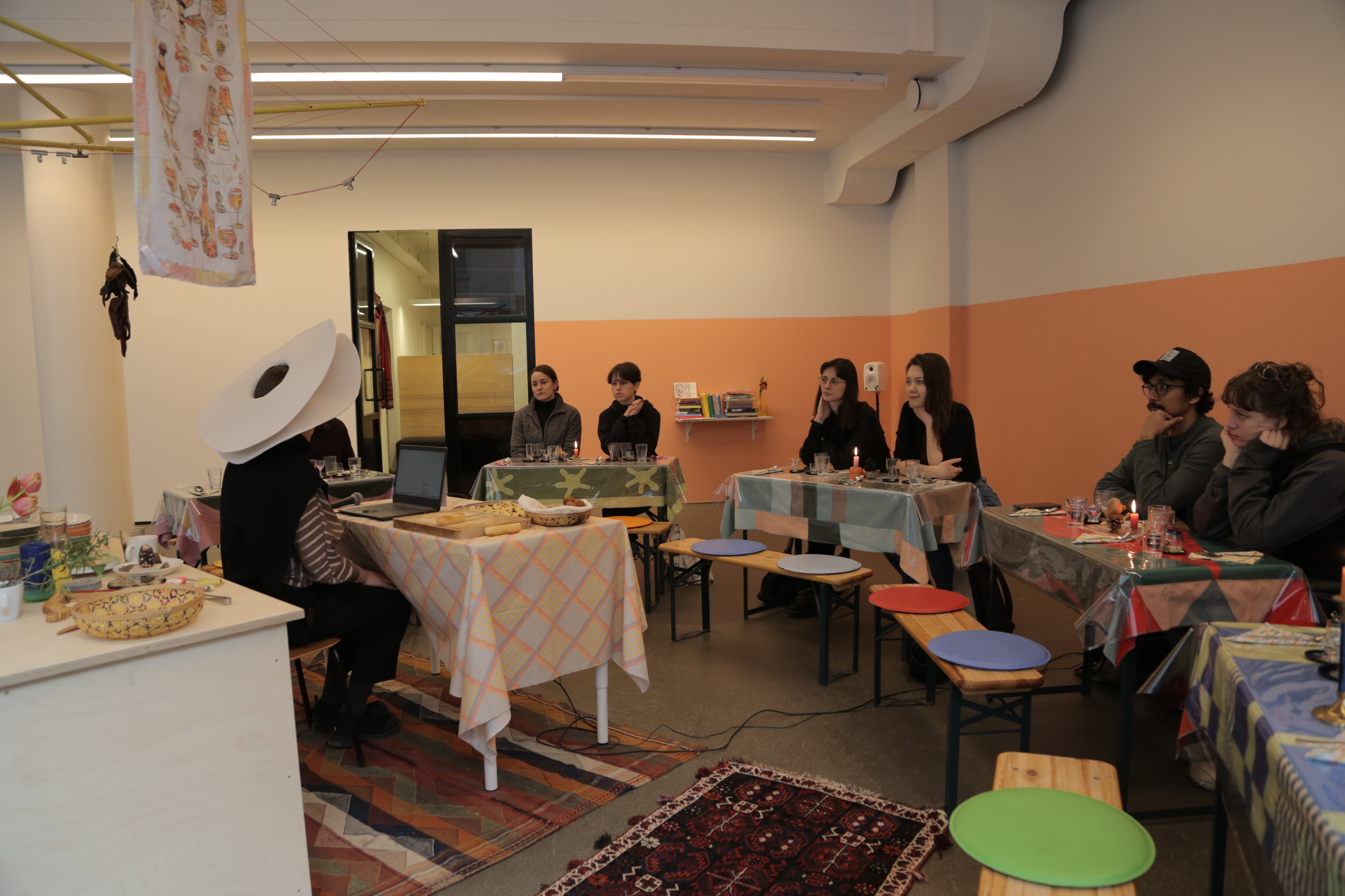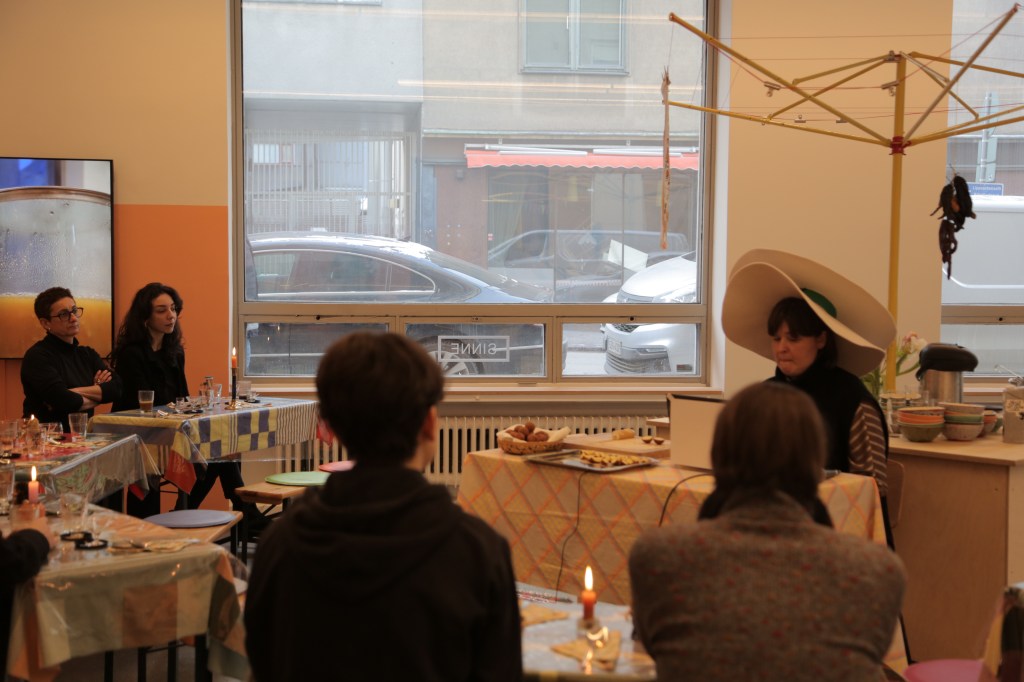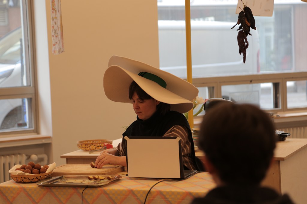 On 16 February, at Sinne gallery, artist, curator, and researcher Agnė Bagdžiūnaitė presented a performative talk titled Conversation With The Anti-fascist Hat at the Everlasting Soup exhibition/canteen. The event invited visitors to engage in a multisensory experience, including the sampling of edible elements, as part of a critical and imaginative exploration of memory, labour, and resistance.